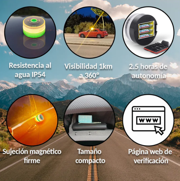 Cuenta con una luz de emergencia de 70 candelas que ofrece una visibilidad de hasta 1 kilómetro en un ángulo de 360°, garantizando que otros conductores detecten tu vehículo con tiempo de sobra, incluso en condiciones de baja luminosidad o mal tiempo. Su certificación IP54 le confiere resistencia al agua y al polvo, por lo que mantiene su rendimiento óptimo sin importar el entorno.